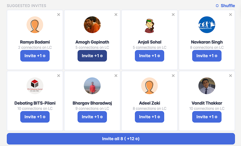 Lunchclub looks at your social media handles and mobile number (whichever you grant access). It does a cross-reference with similar data on other users on the platform and recommend you based on number of connections that contact has on Lunchclub. You can shuffle and see who else you can invite or invite all of them with the click of a single button.